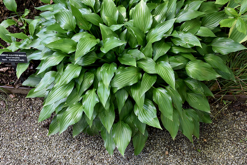 Lanceleaf Hosta will grow to be about 18 inches tall at maturity extending to 24 inches tall with the flowers, with a spread of 3 feet. When grown in masses or used as a bedding plant, individual plants should be spaced approximately 30 inches apart. Its foliage tends to remain dense right to the ground, not requiring facer plants in front. It grows at a medium rate, and under ideal conditions can be expected to live for approximately 10 years. As an herbaceous perennial, this plant will usually die back to the crown each winter, and will regrow from the base each spring. Be careful not to disturb the crown in late winter when it may not be readily seen!