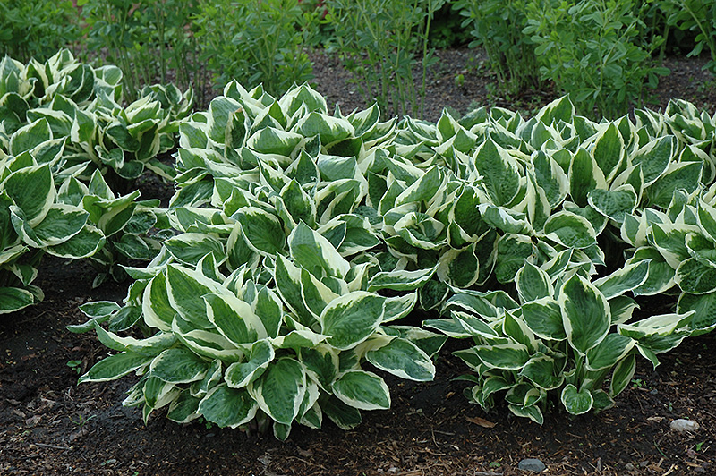 A vigorous variety producing dense mounds of deep green foliage with wide, bright white margins; leaves are slightly cupped and corrugated; pale lavender flowers appear on tall scapes during the midsummer months; adds color and texture to beds and borders