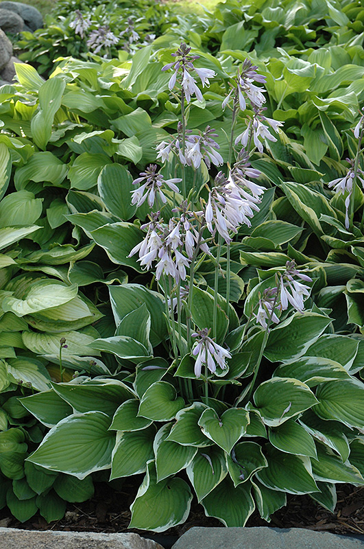Gold-Variegated Mountain Hosta features dainty spikes of lavender bell-shaped flowers rising above the foliage in mid summer. Its attractive enormous textured heart-shaped leaves remain emerald green in color with distinctive white edges throughout the season.