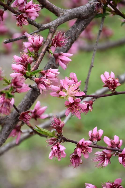 Contender Peach is smothered in stunning clusters of fragrant pink flowers with burgundy calyces along the branches in mid spring, which emerge from distinctive rose flower buds before the leaves. It has dark green deciduous foliage. The narrow leaves turn yellow in fall. The fruits are showy gold drupes with a scarlet blush, which are carried in abundance in mid summer. The fruit can be messy if allowed to drop on the lawn or walkways, and may require occasional clean-up.