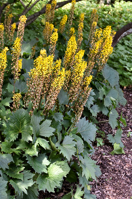 The Rocket Rayflower features bold spikes of yellow flowers rising above the foliage from late spring to mid summer. Its large serrated heart-shaped leaves remain dark green in color throughout the season. The deep purple stems are very colorful and add to the overall interest of the plant.