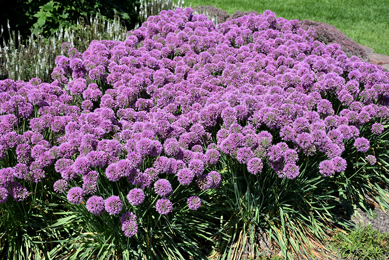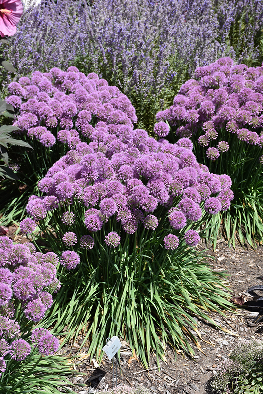 A showy ornamental onion forming an upright clump of blue-green, strappy leaves; a profusion of lilac-purple rounded clusters of flowers in mid-summer; impressive when massed in groupings; great as a long lasting cut flower