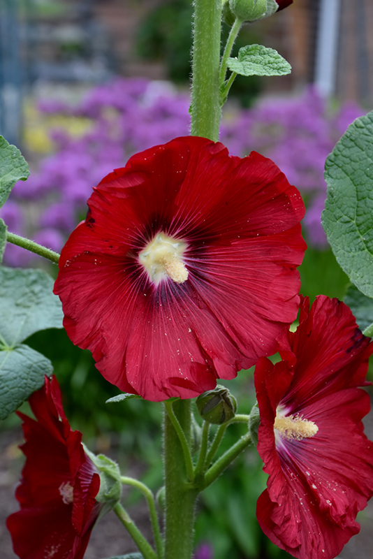 Mars Magic Hollyhock features bold spikes of ruby-red round flowers with creamy white eyes and a deep purple ring rising above the foliage from mid to late summer. The flowers are excellent for cutting. Its large tomentose round leaves remain dark green in color throughout the season.