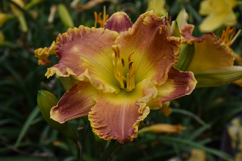 Elegant trumpets are burnt-orange colored with contrasting yellow eye-zones and exceptionally ruffled, pie-crust edges; sturdy, strong, easy to care for, great grassy texture and form; a compact, reblooming variety, great to mass in the garden