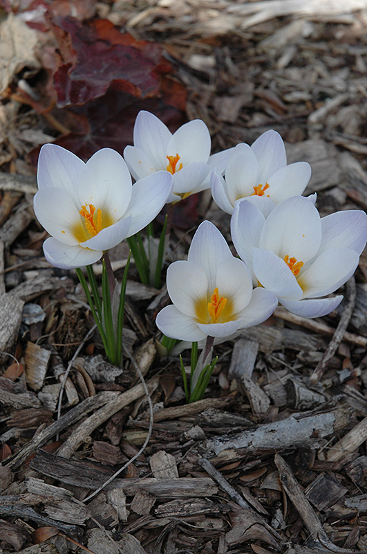 Blue Pearl Crocus has masses of beautiful white cup-shaped flowers with sky blue overtones and yellow eyes at the ends of the stems in early spring, which are most effective when planted in groupings. Its attractive grassy leaves remain forest green in color with prominent white stripes throughout the season.