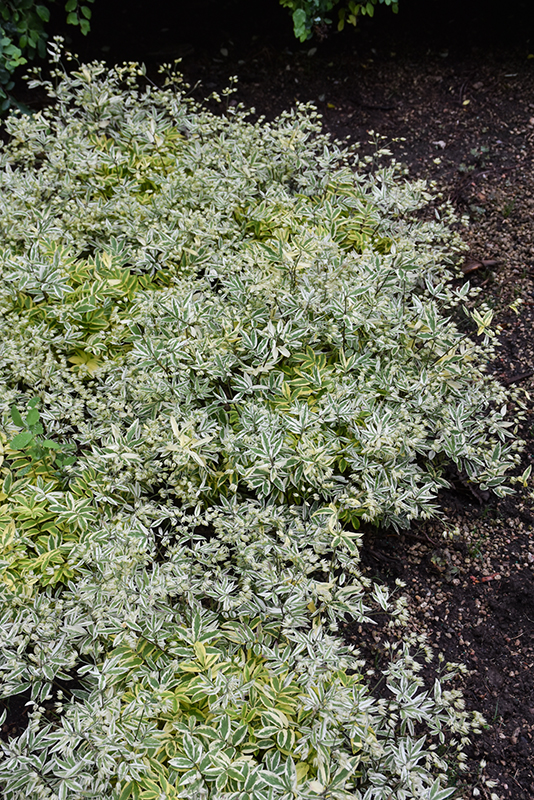 This gorgeous variety forms a ferny mound of variegated green and golden-yellow foliage, that is topped with lilac-mauve flowers in late spring; looks great in beds or borders all season long, and easily mixes with other plants