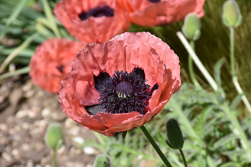Princess Victoria Louise Poppy features bold semi-double salmon round flowers with black eyes at the ends of the stems from early to mid summer. The flowers are excellent for cutting. Its deeply cut ferny leaves remain forest green in color throughout the season.