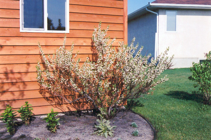 A medium-sized ornamental shrub featuring showy white flowers in spring followed by tart black cherries in summer, good for jams; low growing and wide spreading with good fall color; very hardy and adaptable, excellent for dry locations