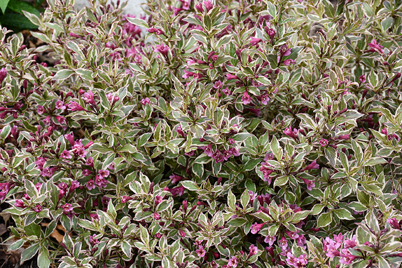 My Monet Purple Effect® Weigela is covered in stunning clusters of rose trumpet-shaped flowers with yellow anthers along the branches in late spring, which emerge from distinctive crimson flower buds. It has attractive creamy white-variegated green foliage with hints of purple. The pointy leaves are highly ornamental and turn outstanding shades of burgundy and in the fall.