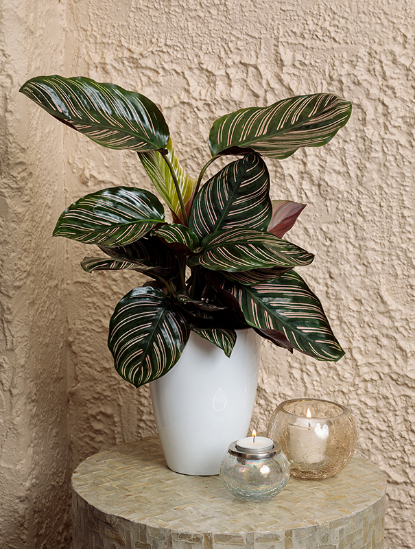Color Full™ Sanderiana Pinstripe Calathea's attractive large glossy oval leaves remain dark green in color with prominent pink stripes and tinges of black throughout the year on a plant with an upright spreading habit of growth.
