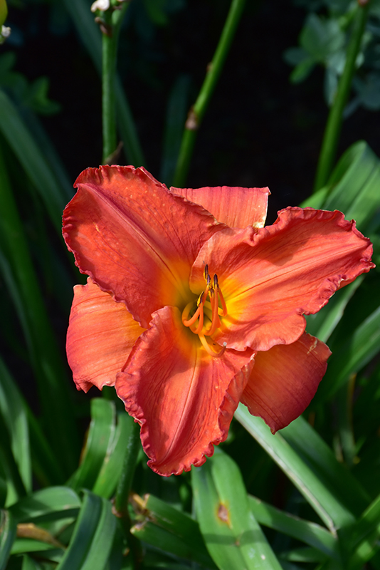 Striking coral-orange ruffled flowers with red eyezone and yellow throats contrast against arching green foliage; mid to late season bloomer, great for adding color into borders, beds and containers; easy to grow and low maintenance