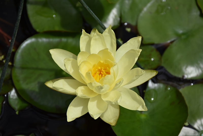 Joey Tomocik Hardy Water Lily features showy fragrant semi-double lemon yellow star-shaped flowers with gold eyes at the ends of the stems from late spring to early fall. The flowers are excellent for cutting. Its attractive large glossy round leaves remain dark green in color with distinctive purple spots throughout the year.