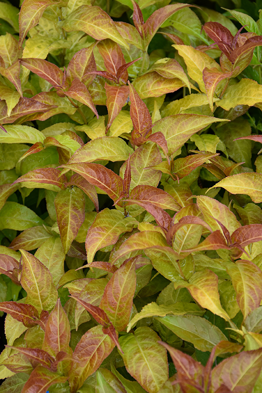 Firefly™ Diervilla features showy panicles of yellow trumpet-shaped flowers along the branches from late spring to early summer. It has attractive orange-variegated gold foliage with hints of chartreuse which emerges brick red in spring. The pointy leaves are highly ornamental and turn outstanding shades of orange and in the fall.