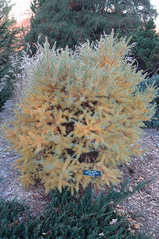 Deborah Waxman Dwarf Tamarack is primarily valued in the landscape or garden for its distinctively pyramidal habit of growth. It has bluish-green deciduous foliage which emerges light green in spring. The needle-like leaves turn an outstanding yellow in the fall. The rose fruits are held in cones in late spring. The rough gray bark and gold branches add an interesting dimension to the landscape.