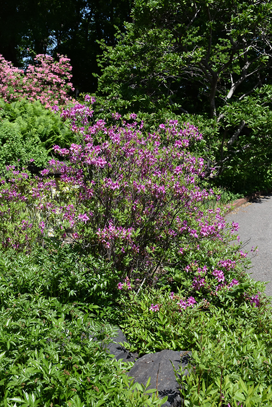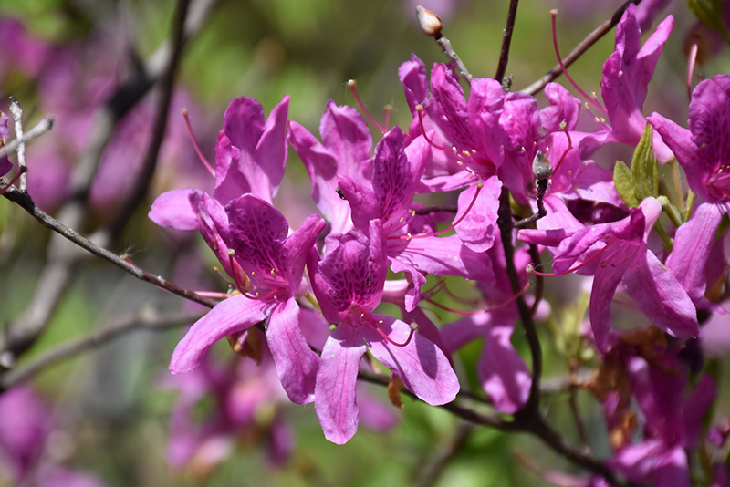 Lilac Lights Azalea is blanketed in stunning clusters of lilac purple trumpet-shaped flowers with fuchsia spots at the ends of the branches in mid spring before the leaves. It has green deciduous foliage. The narrow leaves turn yellow in fall.
