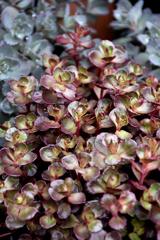 Voodoo Stonecrop will grow to be only 4 inches tall at maturity, with a spread of 18 inches. When grown in masses or used as a bedding plant, individual plants should be spaced approximately 15 inches apart. Its foliage tends to remain low and dense right to the ground. It grows at a fast rate, and under ideal conditions can be expected to live for approximately 10 years. As an herbaceous perennial, this plant will usually die back to the crown each winter, and will regrow from the base each spring. Be careful not to disturb the crown in late winter when it may not be readily seen!