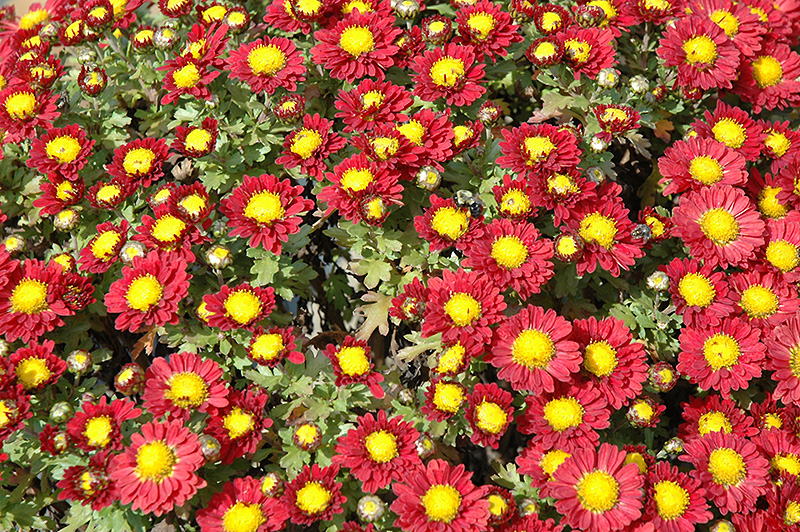 Red Daisy Chrysanthemum is covered in stunning red daisy flowers with yellow eyes at the ends of the stems from early to late fall. The flowers are excellent for cutting. Its fragrant ferny leaves remain dark green in color throughout the season.