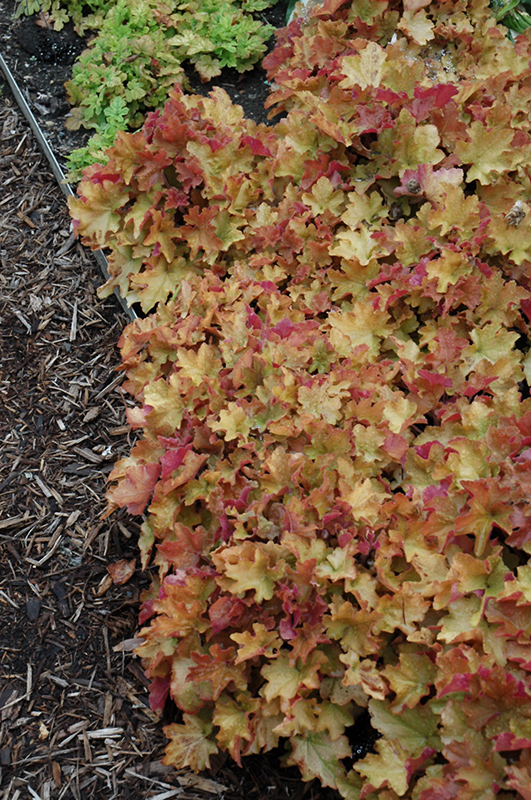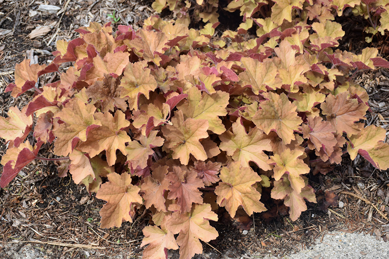 Caramel Coral Bells will grow to be about 10 inches tall at maturity extending to 18 inches tall with the flowers, with a spread of 18 inches. When grown in masses or used as a bedding plant, individual plants should be spaced approximately 15 inches apart. Its foliage tends to remain low and dense right to the ground. It grows at a medium rate, and under ideal conditions can be expected to live for approximately 10 years. As an evegreen perennial, this plant will typically keep its form and foliage year-round.