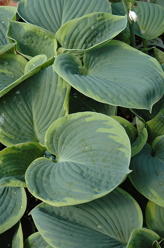Olive Bailey Langdon Hosta features dainty spikes of white tubular flowers rising above the foliage in mid summer. Its attractive textured heart-shaped leaves remain blue in color with showy gold variegation throughout the season.