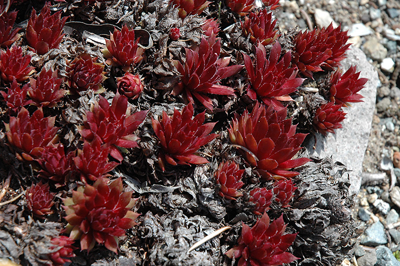 Royal Ruby Hens And Chicks will grow to be only 3 inches tall at maturity extending to 12 inches tall with the flowers, with a spread of 12 inches. When grown in masses or used as a bedding plant, individual plants should be spaced approximately 10 inches apart. Its foliage tends to remain low and dense right to the ground. It grows at a medium rate, and under ideal conditions can be expected to live for approximately 20 years. As an herbaceous perennial, this plant will usually die back to the crown each winter, and will regrow from the base each spring. Be careful not to disturb the crown in late winter when it may not be readily seen!