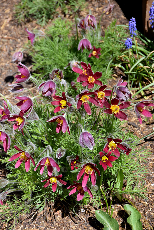 A red form that produces a beautiful cluster of furry buds followed by large wine-red flowers in the spring over the silvery fern-like foliage; an ideal rockery plant that improves with time if left alone