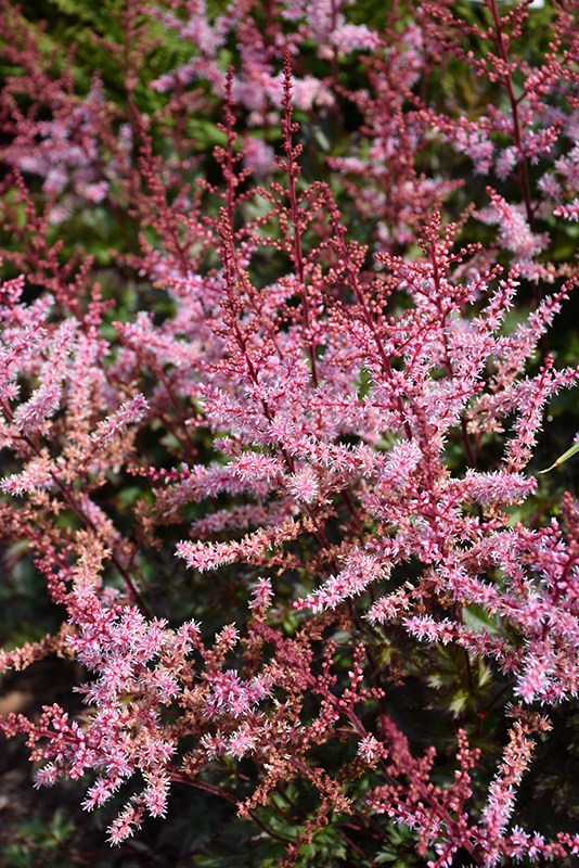 Striking apricot-pink colored plumes rising above glossy leaves; perfect in a shady spot with dappled light; prefers moisture so water regularly for abundant flowers and nice foliage