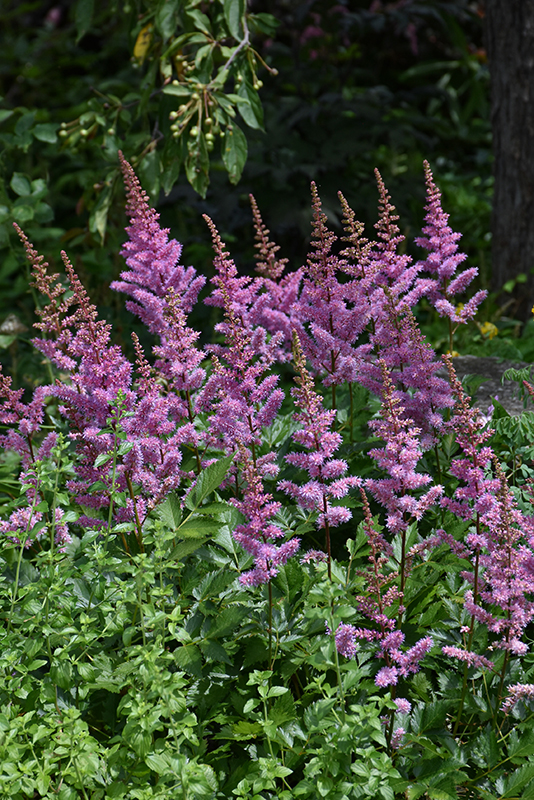 Striking lavender-purple colored plumes rising above glossy leaves; perfect in a shady spot with dappled light; prefers moisture so water regularly for abundant flowers and nice foliage