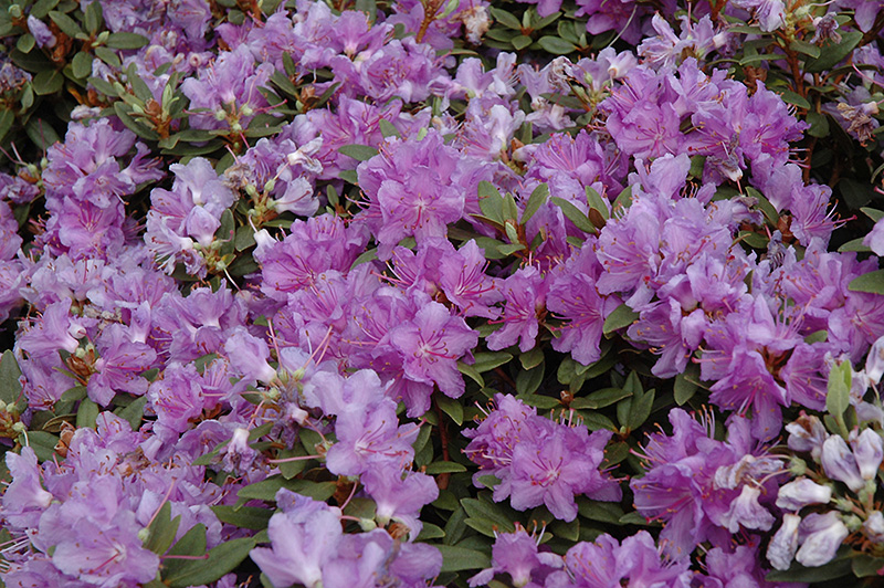 Purple Gem Rhododendron is covered in stunning clusters of lightly-scented purple trumpet-shaped flowers with violet streaks at the ends of the branches in mid spring. It has olive green evergreen foliage which emerges bluish-green in spring. The glossy narrow leaves turn an outstanding coppery-bronze in the fall, which persists throughout the winter.