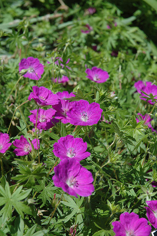 Perfect as a groundcover, this low mounded variety has small, deeply lobed leaves that turn crimson red in the fall; bathed in beautiful purple saucer-shaped blooms throughout summer; deadhead spent flowers for reblooming later in the season