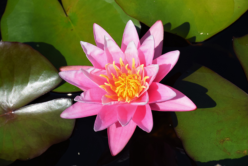 Pink Sensation Hardy Water Lily features showy fragrant semi-double pink star-shaped flowers with yellow eyes at the ends of the stems from early to late summer. The flowers are excellent for cutting. Its attractive large glossy round leaves emerge burgundy in spring, turning dark green in color with distinctive red spots the rest of the year.